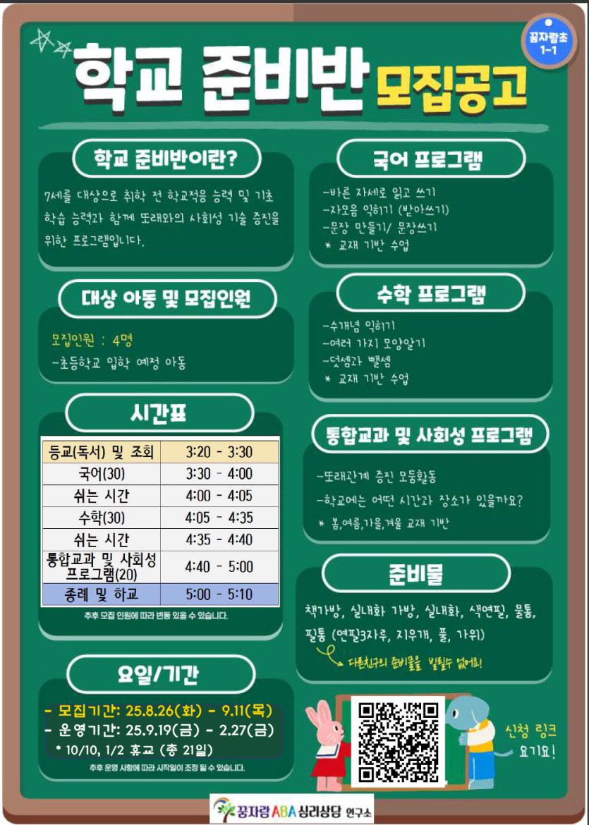 꿈자람ABA심리상담연구소 [학교준비반] 모집공고(2025) 페이지 정보 작성자관리자 댓글0건 조회86회 작성일25.09.01 10:49 본문 공유 학교준비반 모집공고(2025) 댓글 0 댓글목록 등록된 댓글이 없습니다.